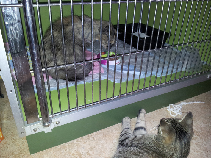 Vor dem Käfig, Jackson (Hauskater),den sie von drinnen anpfaucht...