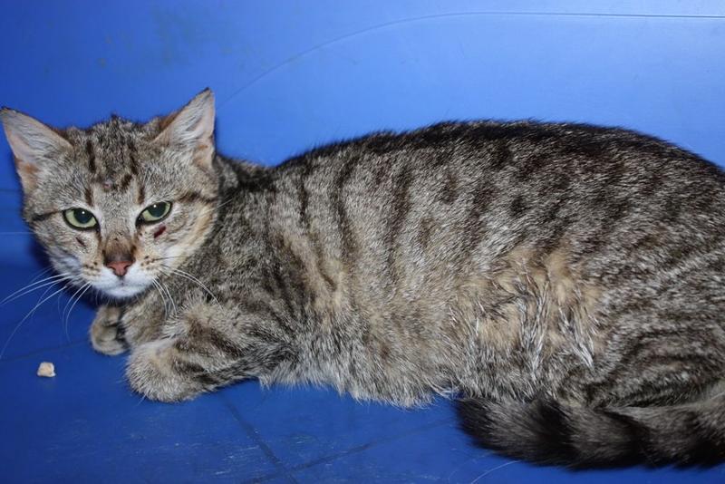 - ca. 9-10 Monate altes Tigermädchen NOSI, schon kastriert, recht scheu. Die Verletzungen bei den Augen hat sie sich selber in der Falle bei ihren Ausbruchsversuchen zugefügt