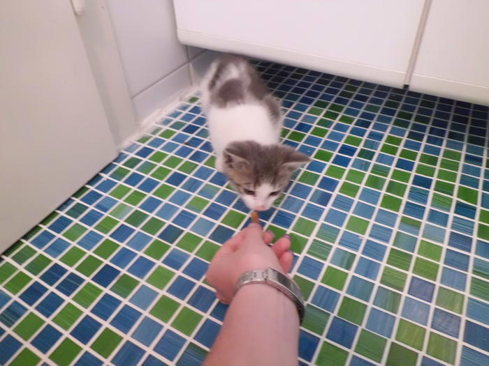 Er hat auch noch Angst vor Menschen und versteckt sich, er faucht allerdings nicht und lässt sich leicht nehmen. Gestern hatte ich ihn schon kurz auf meinem Schoß und hab ihn gestreichelt ... er hat sich wahrscheinlich trotzdem nicht wirklich sicher gefühlt, aber wir haben zumindest schon ein bisserl gekuschelt und er hat gesehen, dass ihm nix passiert!  :O ;)