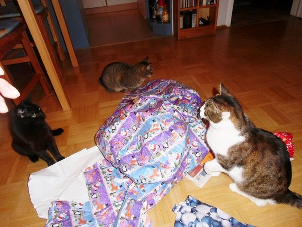 Schön dass ihr so viele Zweibeiner kennt, die euch (und euer Frauli) lieb haben. Von mir kommt auch noch was. Ist aber nicht so toll verpackt...... Dafür könnt ihr dann gleich damit spielen....... Gebs morgen eurem Frauli mit! :kacsint2: