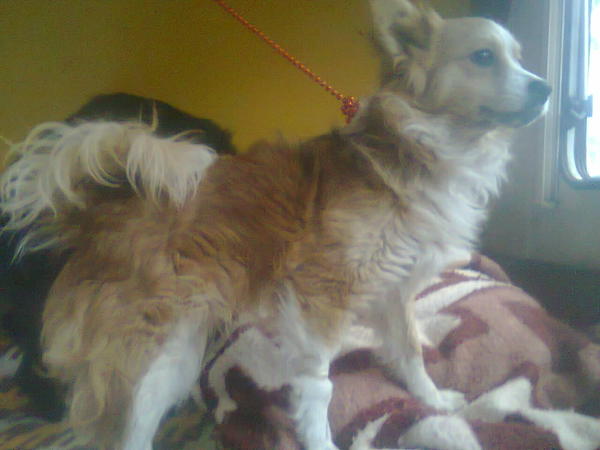 Ein Spitzmixrüde, weiss mit rot (schaut ähnlich aus wie Carlo in Nitra) ...