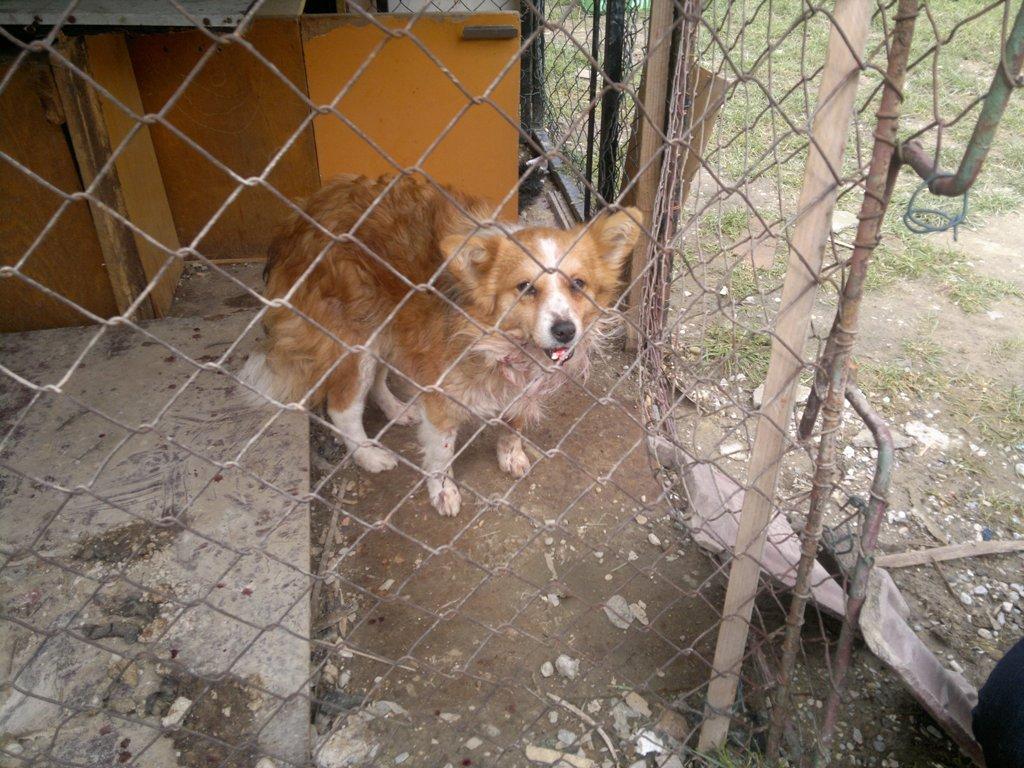 Ein Spitzmixrüde, weiss mit rot (schaut ähnlich aus wie Carlo in Nitra) ist bei seiner Besitzerin in eine gröbere Rauferei verwickelt worden.