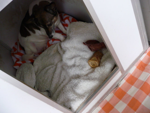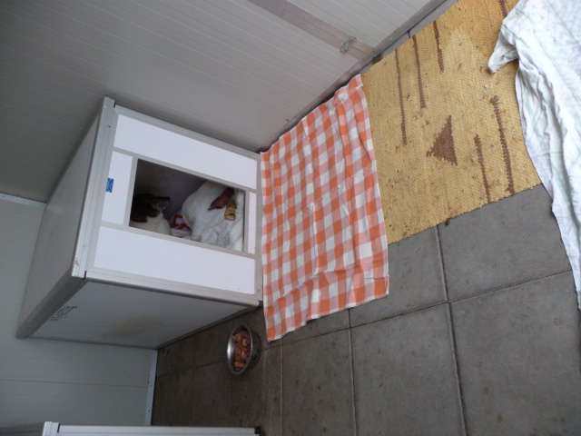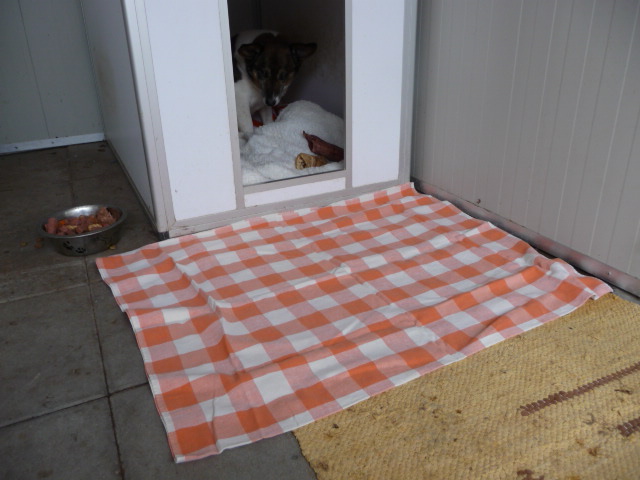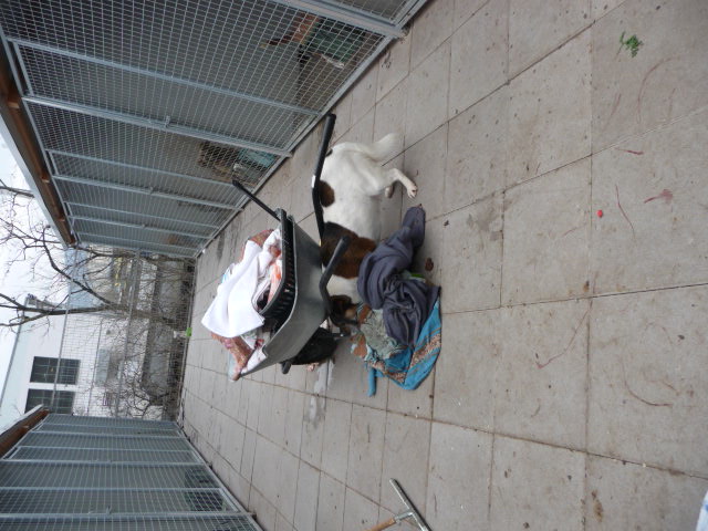 Ja,  die zwei kleinen schwarz/braunen Hündinnen (beide noch total scheu und ziemlich hysterisch)  sitzen noch bei ihm im Käfig.